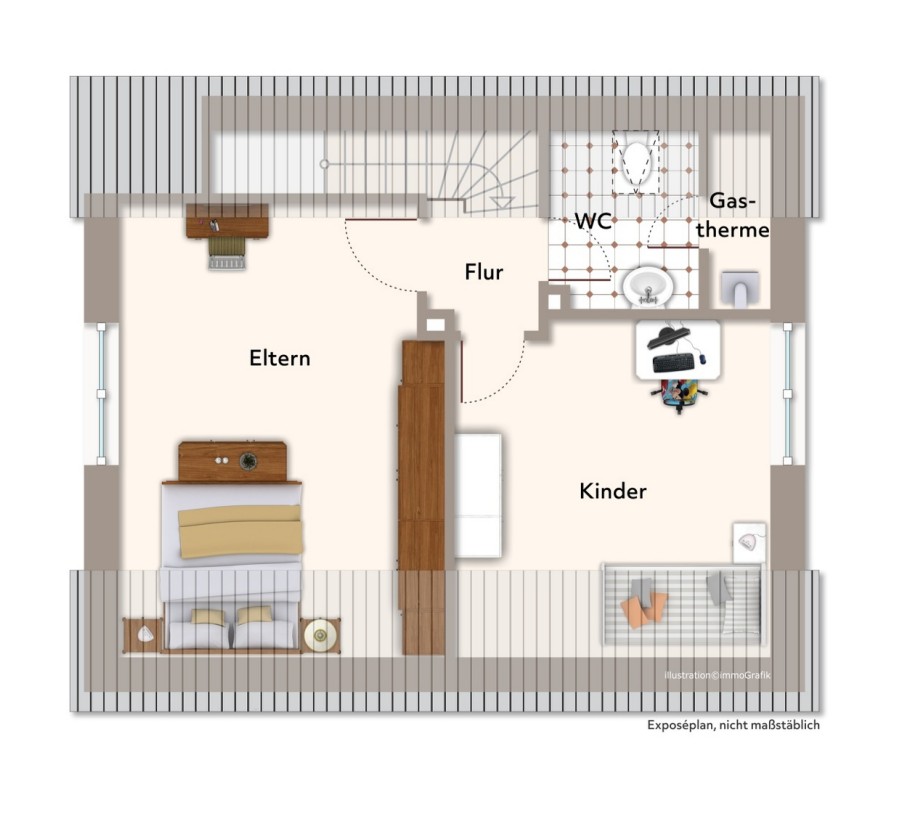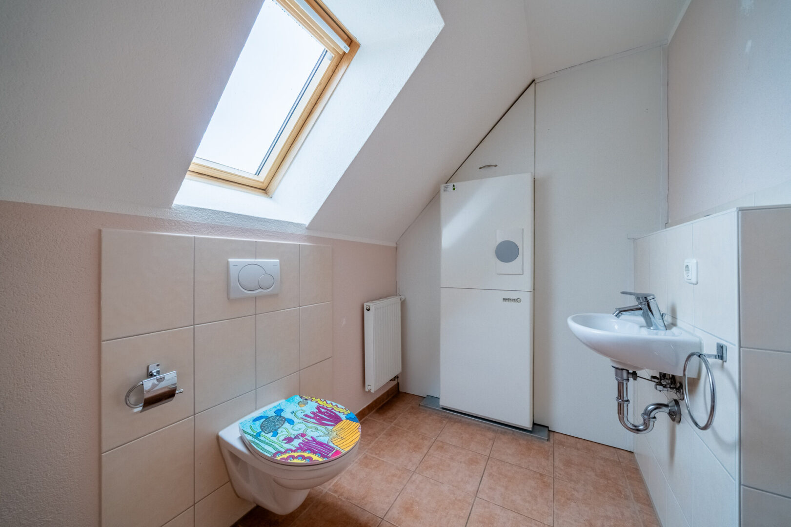 Das Obergeschoss verfügt über zwei Schlafzimmer sowie eine Gästetoilette mit Waschbecken.