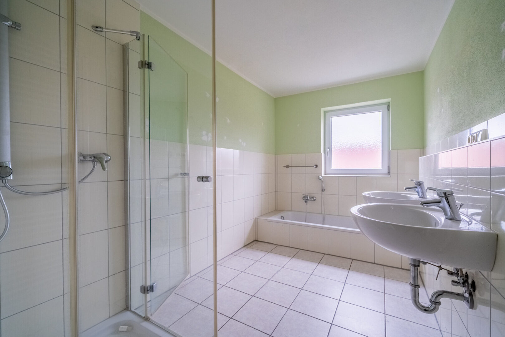 Das Erdgeschoss bietet eine Küche, ein geräumiges Badezimmer mit zwei Waschbecken, Wanne, Dusche, Toilette und Handtuchheizkörper, einen großzügigen Wohn- und Essbereich mit Zugang zur Terrasse und zum eingewachsenen Garten – perfekt für entspannte Stunden im Freien.