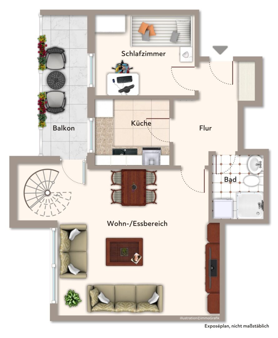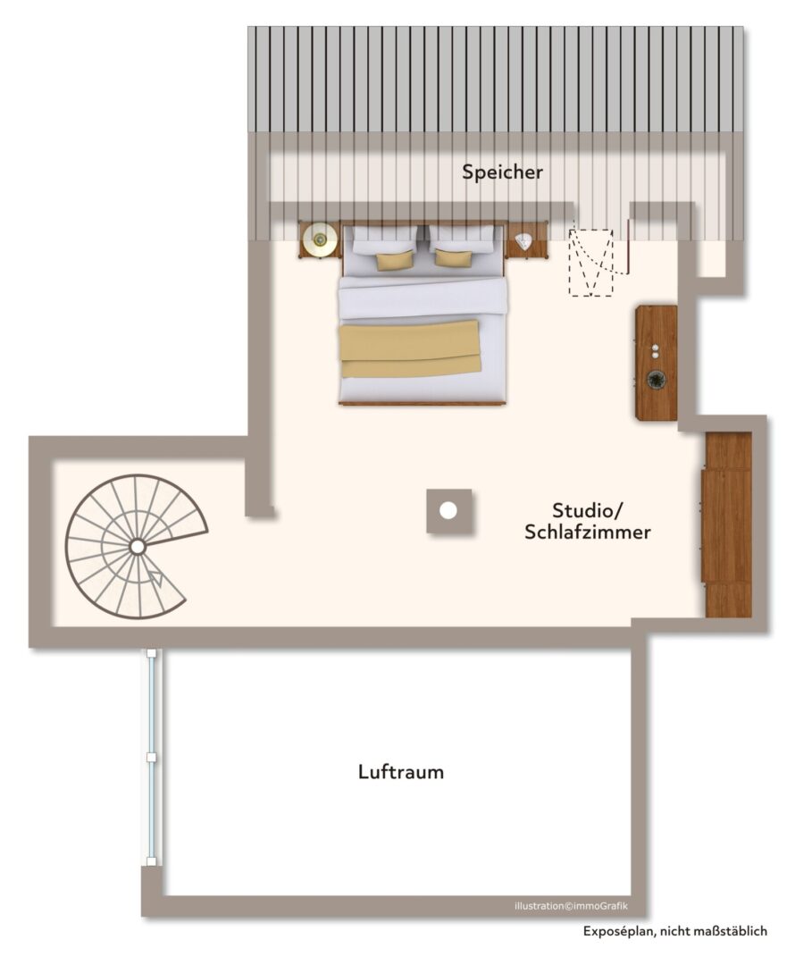 Sie umfasst im 2. Obergeschoss eine Diele, Schlafzimmer, Badezimmer, Küche sowie Wohn-/ Essbereich mit Wendeltreppe in das Dachgeschoss, in dem ein weiteres Zimmer / Studio vorhanden ist. Die Einbauküche ist ausgestattet mit Spüle, E-Herd, Cerankochfeld, Backofen und Dunstabzug.