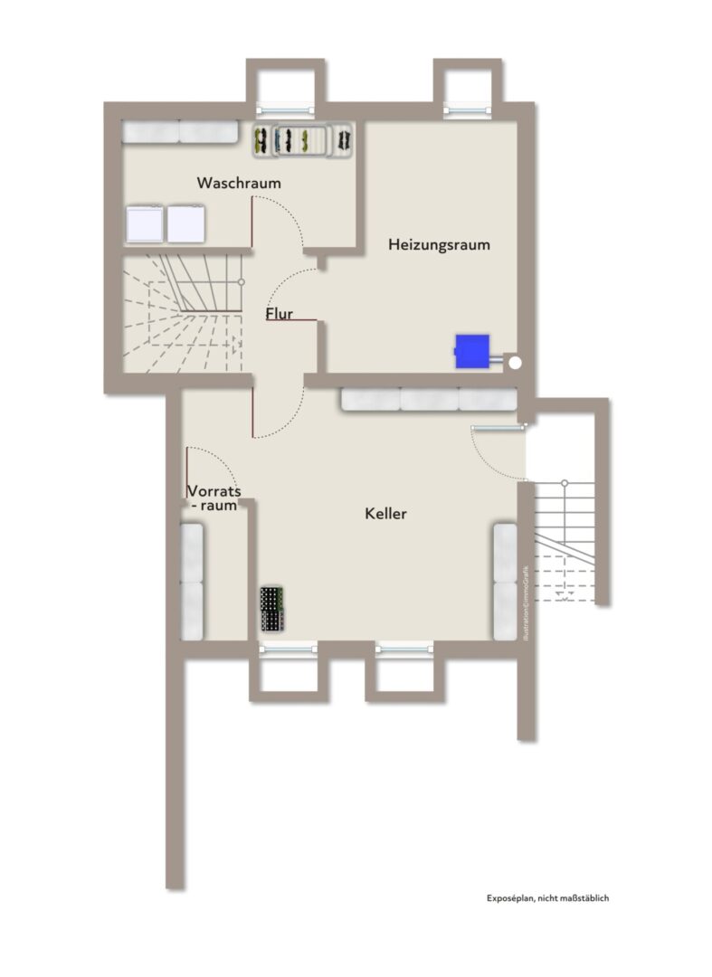 Der Keller teilt sich auf einen Wasch-, Heizungs- und kleinen Abstellraum sowie einen Kellerraum mit Außentreppe auf.