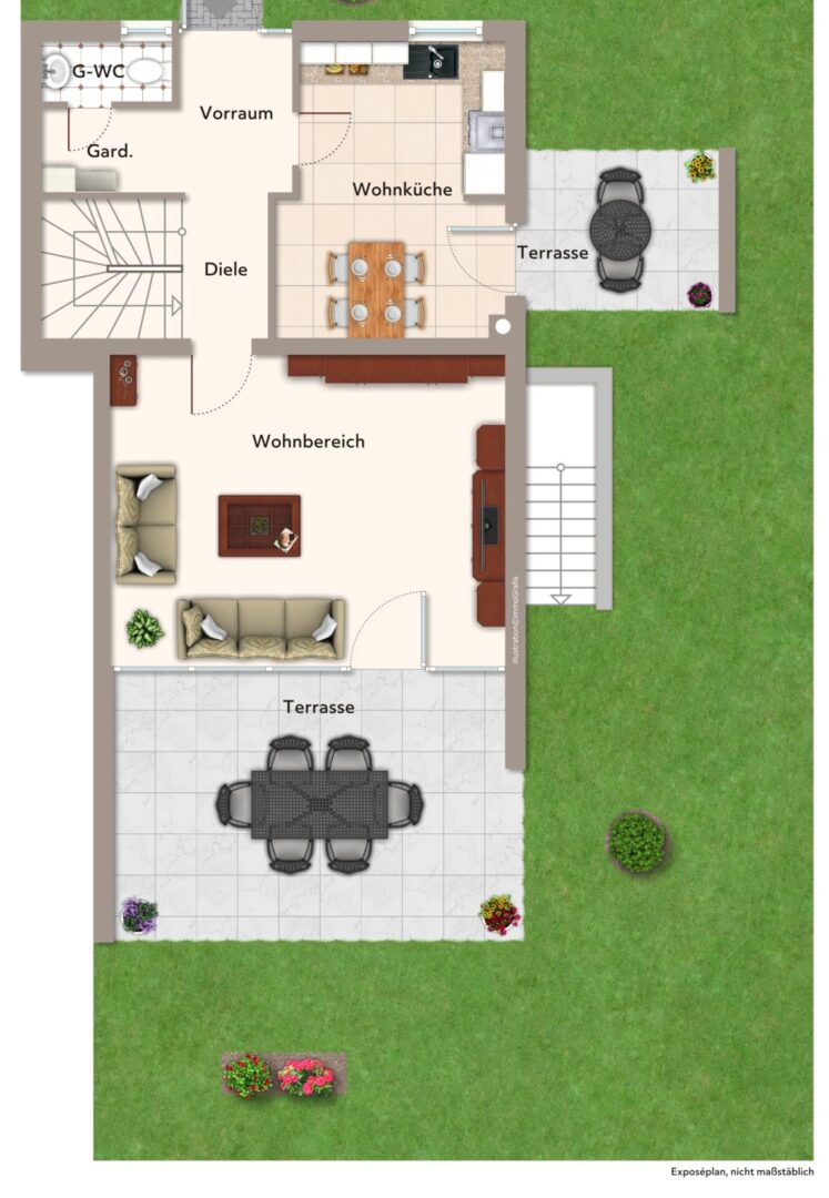 Der Grundriss ist klassisch gestaltet. Das Erdgeschoss verfügt über einen Garderobenbereich, ein Gäste-WC, eine Wohnküche mit eigener Südost-Terrasse sowie den hellen Wohn- und Essbereich mit Zugang zur Südwest-Terrasse.